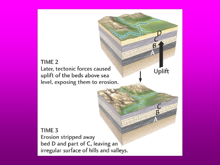 Most of geologic time goes unrecorded Sometimes NO SEDIMENT is DEPOSITED over an interval of time (hiatus) Other times sediment is eroded away. This is happening here: Mississippi Valley is filling whereas the higher ground is being eroded away.