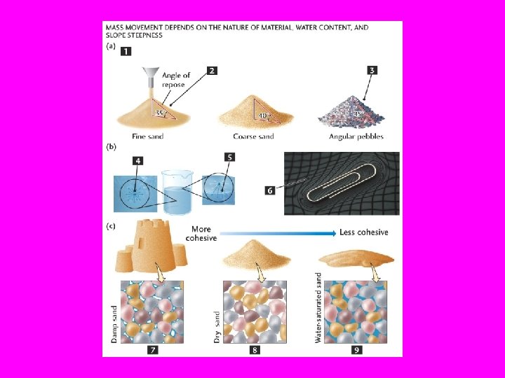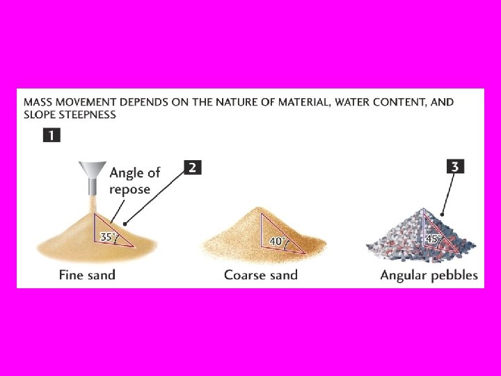What if the sand is dry? ? ? Sand is an analog for unconsolidated materials (materials whose grains are not held together, … there is no internal “cement”) Mass wasting will take place more readily if the slope increases beyond some critical value and if the material is unconcolidated. The critical value is the natural angle of repose, or the maximum angle of stability before the material will flow, e. g. ice, snow, soil, sand have different slopes.