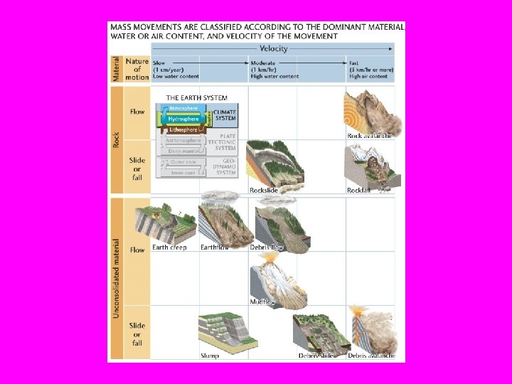 How do we classify types of Mass Movement? Based on SPEED and MATERIAL composition e. g. , fast (>=5 km/hour) e. g. , rockslide e. g. , ~1 km/hr slow and soft sediment is creep e. g. , moderately fast and soft -- debris flow In Louisiana we have slumps on the sides of ramps along I-10 and I-12 and along faults