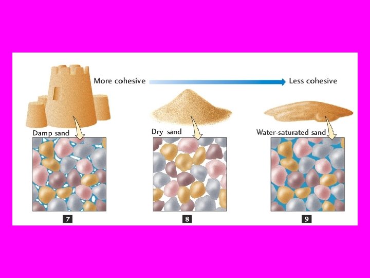 Water and slope stability Internally, there are forces holding the sand grains together. These forces are surface tension between the grains and water wetting these grains. There is a net, inward surface-based attraction. (A little water is good) If there is too much water, the water begins to push the grains away from each other. The weight of the water pushes outwardly (liquefaction). (Too much water is bad) What part of the beach do you run on? Why?