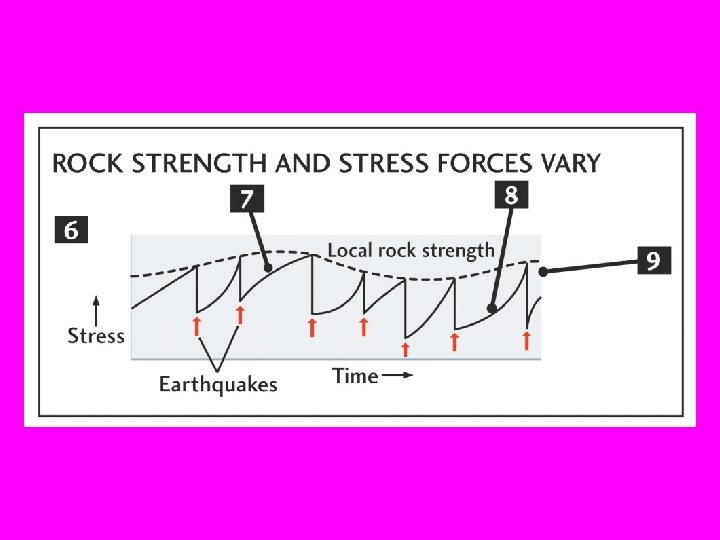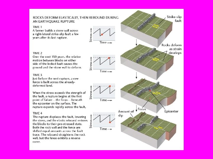 Elastic Rebound Theory • There are two important concepts you should be aware of. Stress in earth sciences refers to the pressure the rock experiences and strain is the actual damage or resultant deformation that we can measure. • While the pressure builds up in the rock DOES deform or strain. However, it does so elastically. That is if you release the rock from under stress it will BOUNCE back without any signs of damage. Normal rocks are usually only able to take a small (1 -2%) of elastic strain. Stretching or thinnning beyond 1 -2% can cause permanent damage.
