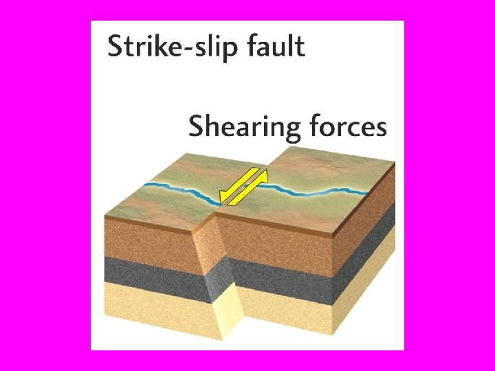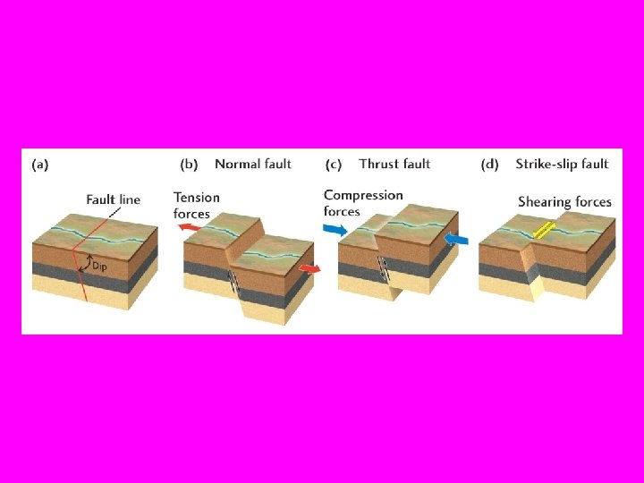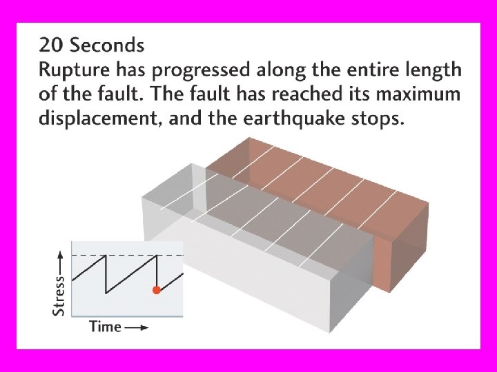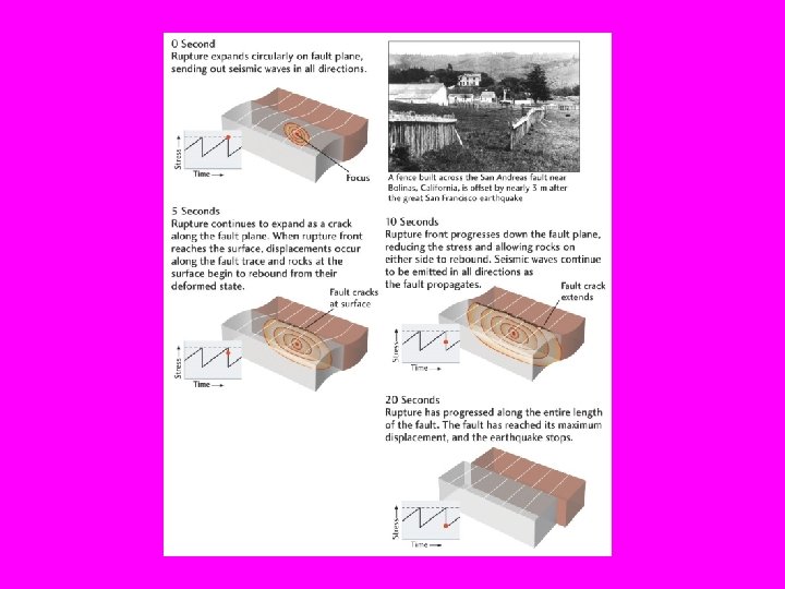 Elastic Rebound Theory • When the rock breaks or ruptures some of the energy goes into breaking the rock and a lot of it goes into moving the surround rocks. • The rupture itself may remain buried, invisible underground (a blind fault). A rupture may or may not reach the surface. • After the stress or pressure is release the rock seals ahd again starts to accumulate stress.