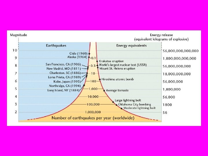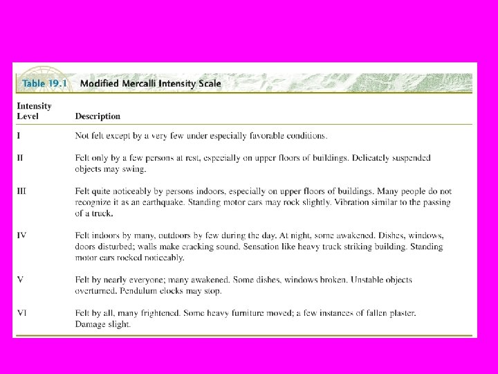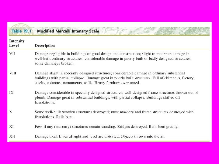 Size of an Earthquake (1) The Modified Mercalli Intensity scale describes the perceived intensity and damage, in 12 degrees, of the shaking and is useful when there are no seismographs, as in historical earthquakes (e. g. New Madrid 7. 5, 1811, Missouri). Damage depends on whethere are people to witness the earthquake effect and on local conditions.
