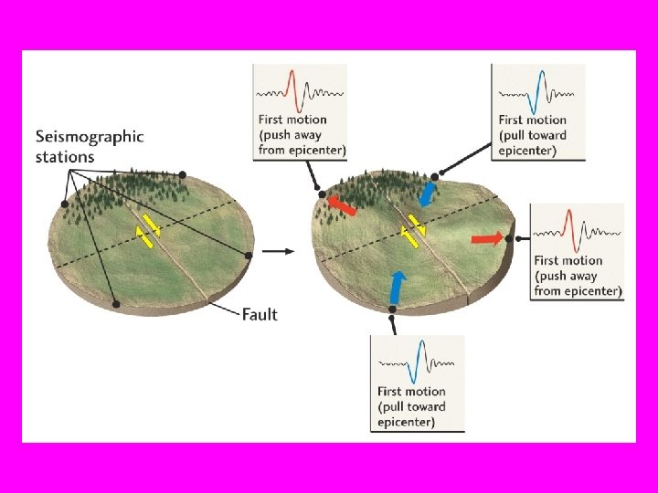ACTIVE FAULTS GENERATE EARTHQUAKES (3) • A first motion for a strike-slip fault in a horizontal direction is IN to the fault in certain orientations and OUT from the fault in other orientations. The first motion changes every 90 degrees around the epicenter.