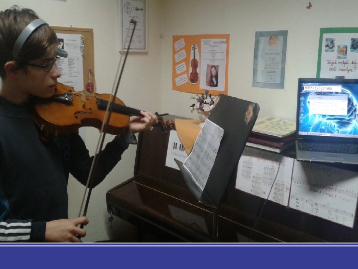 Research • The study aims to test instrumentalist students’ attention and mediation levels during music reading by means of Neuro. Sky’s Mind. Wave EEG device. • We investigated wind instrumentalists, 12 -14 years of age, and compared them with violin players matched for age and grade level. • The research was carried out in 2 music schools in March 2018 (Dr. Márta Janurik) • Students were asked to play an eight-bar composition of Szilvay – Colour String Method, based on the Kodály concept. • We analyzed attention and mediation levels, blinks (alpha, beta and gamma band oscillatory responses) to the musical piece during reading.