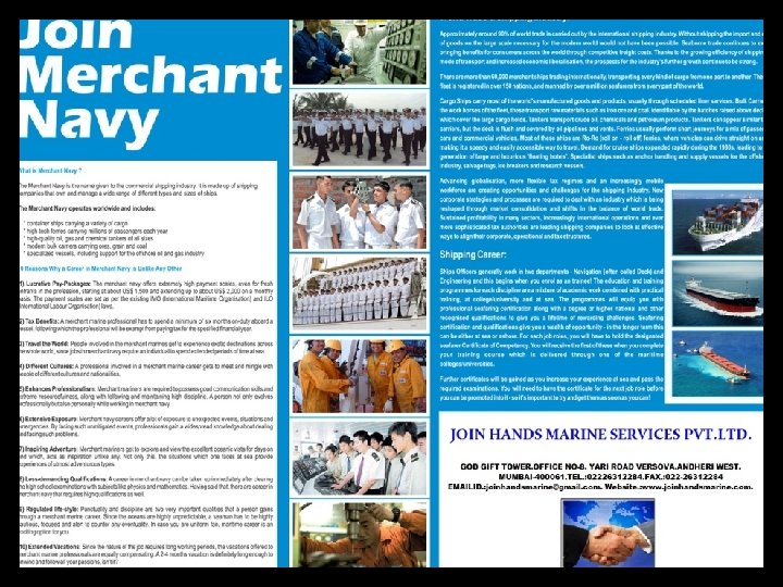 JOIN HANDS MARINE SERVICES PVT. LTD. GOD GIFT TOWER. OFFICE NO-8. YARI ROAD VERSOVA, ANDHERI WEST. MUMBAI-400061. TEL. : 02226312284 / 02268888766 EMAILID. : joinhandsmarine@gmail. com. Website. : www. joinhandsmarine. com