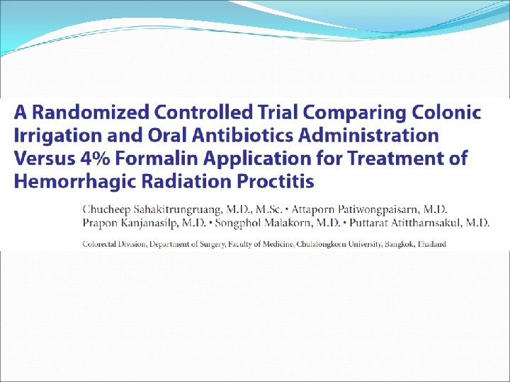 Reference � Management of Radiation Proctitis. William M. Mendenhall et al. American Journal of Clinical Oncology, 2012. � A randomized controlled trial comparing colonic irrigation and oral antibiotics administration versus 4% formalin application for treatment of haemorrhagic radiation proctitis. Chucheep Sahakitrungruang et al. Dis Colon rectum 2012; 55: 1053 -1058. � Endoscopic and medical therapy for chronic radiation proctopathy: a systematic review. Brian Hanson et at. Dis Colon Rectum 2012; 55: 1081 -1095 � Nhue L. Do et al. Radiation proctitis: Current Strategies in management. Gastroenterology Research and Practice. Volume 2011. � C. G. Wilet et al. Acute and late toxicity of patients with inflammatory bowel disease undergoing irradiation for abdominal and pelvic neoplasms. Int J Rad Onc Bio Phy. Vol 46, No. 4 pp 995 -998, 2000 � V. P. Nelamangala Ramakrishnaiah et al. Colorectal Disease 2012, Vol 14, 876 -882. � Alfadhli et al. Efficacy of argon plasma coagulation compared to topical formalin application for chronic radiation proctopathy. Cancer J Gastroenterology 2008. � Karamanolis et al. Argon plasma coagulation has a long-lasting therapeutic effect in patients with chronic radiation proctitis. Endoscopy 2009. � R. E. Clake et al. Hyperbaric oxygen treatment of chronic refectory radiation proctitis: A randomized and controlled double blind crossover trial with long term follow up. Int J Rad Onc Bio Phy. Vol 72, No. 1. pp 134 -143, 2008