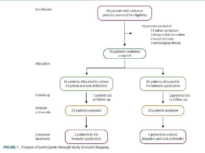 �Comparing 50 patients with radiation proctitis using formalin dab vs tap water irrigation and antibiotics treatment from 2010 to 2012 �Patients with other complications from radiation e. g. fistula, rectal ulcers, strictures were excluded �Patient was assessed 8 weeks after treatment �Symptoms, satisfaction, sigmoidoscopy findings