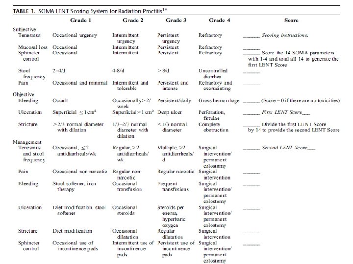 Grading of severity �LENT – SOMA ( Late Effect Normal Tissue – Subjective Objective Management Analysis) Scale �National Cancer Institute Common Toxicity Criteria for Adverse Event Version 4 �Various grading system employed across different studies �Frequency of symptoms and requirement of intervention