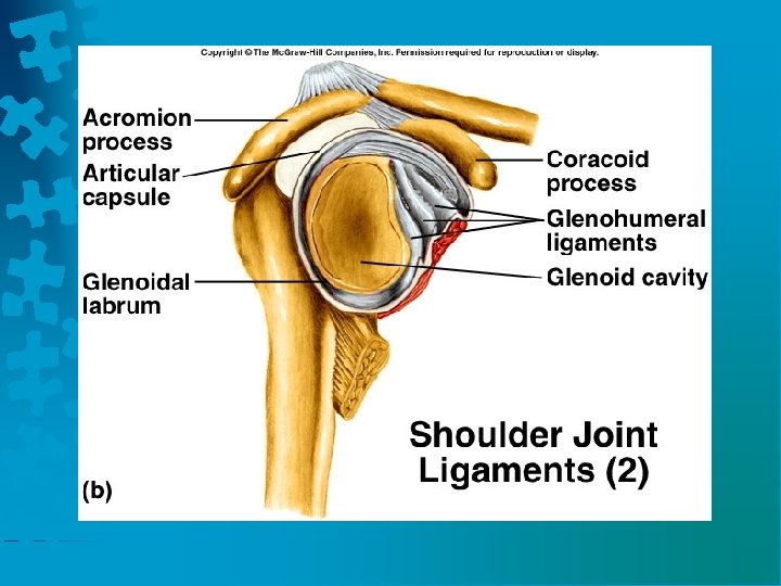 Shoulder Joint • Ligaments: coracohumeral ligament, glenohumeral ligaments, transverse humeral ligament, and glenoid labrum • Bursae: subscapular, subdeltoid, subacromial, subcorocoid bursae