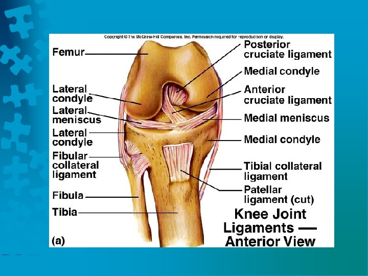Knee Joint • Ligaments of the knee joint: patella, oblique popliteal, arcuate popliteal, tibial collateral (MCL), fibular collateral ligament (LCL), anterior cruciate ligament (ACL) strengthen the joint capsule. • Cruciate ligaments prevent displacement of articulating surfaces. • Two fibrocartilaginous menisci separate the articulating surfaces.