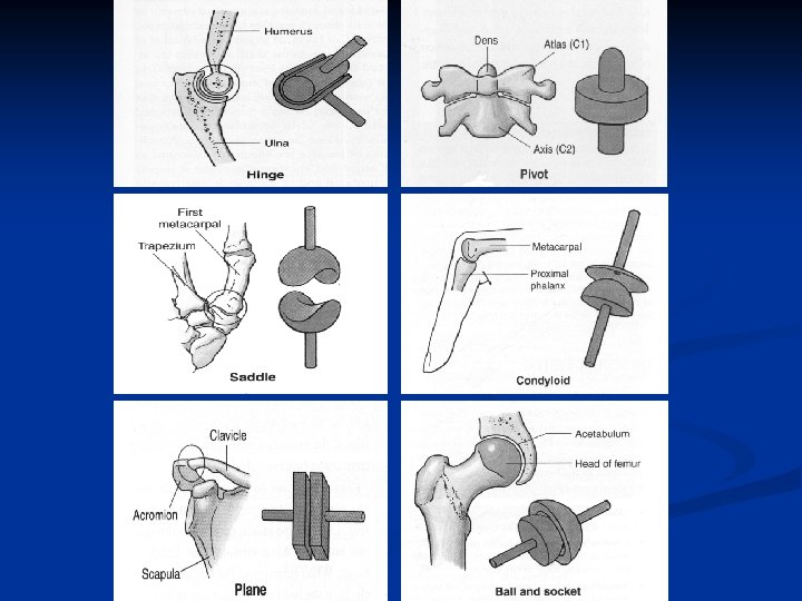 Synovial Joints n Allow considerable movement n Most joints that unite bones of axial and peripheral skeleton n Articular cartilage and disks n Joint cavity and capsule n n Synovial membrane and fluid Bursae