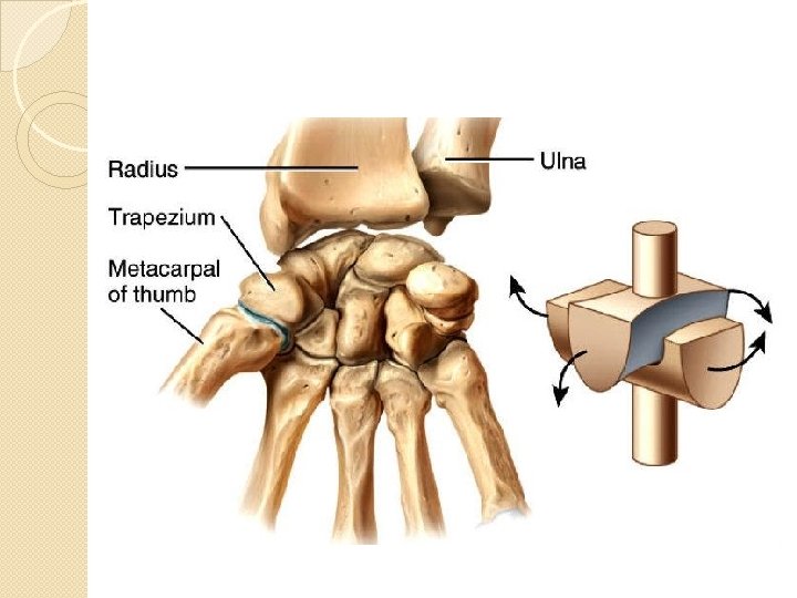 Saddle Joint �Bilateral �(flexion-extension, abduction-adduction) �Bone are set together as in sitting on a horse Example �Carpometacarpal joint