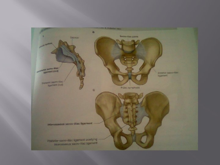 � The sacro-iliac joints transmit forces from the lower limbs to the vertebral column. � The joints often become fibrous with age and may become completely ossified. � Each sacro-iliac joints is stabilized by 3 ligaments; Anterior sacro-iliac ligaments Interosseous sacro-iliac ligaments Posterior sacro-iliac ligaments I. III. � These ligaments allow movements.