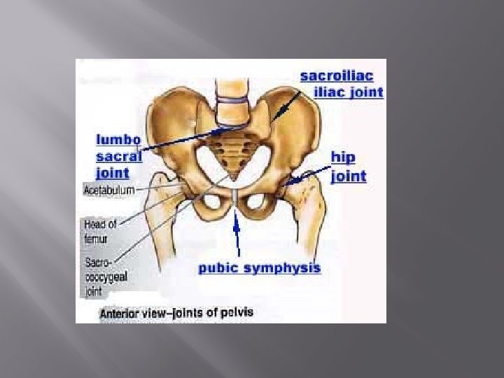 JOINTS There are 3 major joints in the pelvis. 1. 2. 3. Lumbosacral joint Sacroiliac joint Pubic symphysis