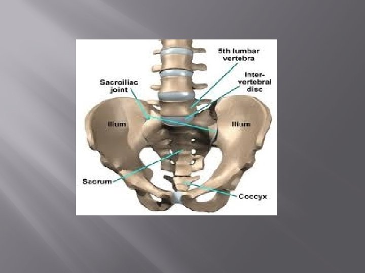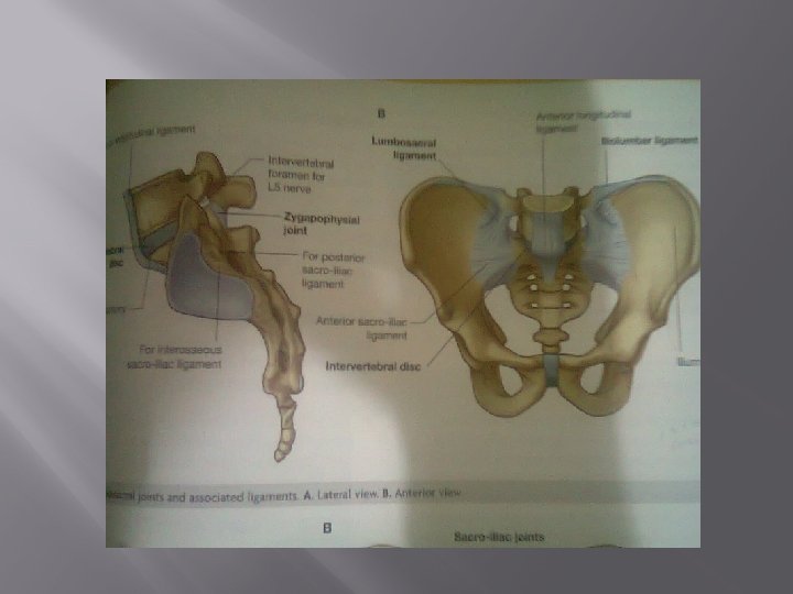 � The sacrum articulates superiorly with the lumber part of the vertebral column. � The lumbosacral joints are formed between vertebra LV and the sacrum. � It consists of, 2 zygapophysial joints an intervertebral disc I. II. � The lumbosacral joints are reinforced by strong iliolumbar and lumbosacral ligaments that extend from the expended transverse processes of vertebra LV to the ilium and the sacrum.