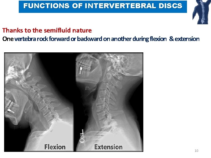 FUNCTIONS OF INTERVERTEBRAL DISCS Thanks to the semifluid nature One vertebra rock forward or backward on another during flexion & extension 10