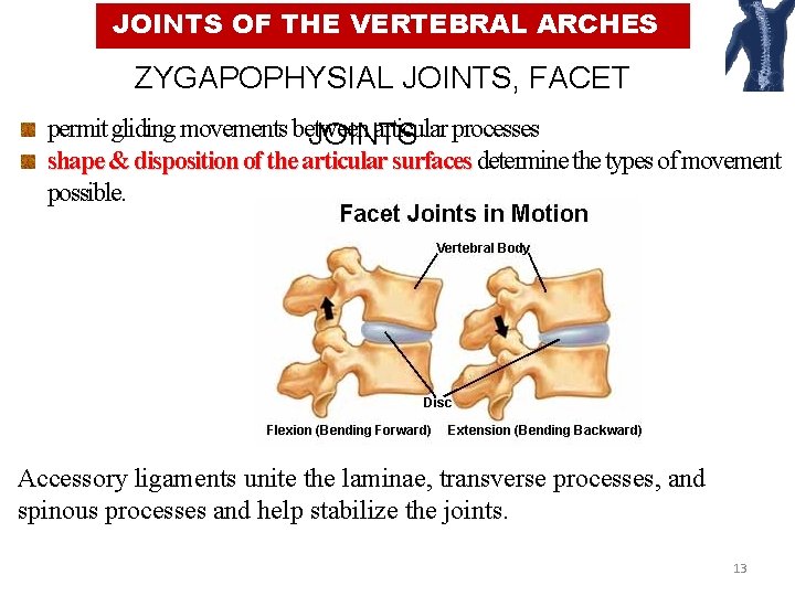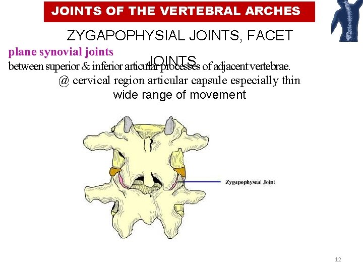 JOINTS OF THE VERTEBRAL ARCHES ZYGAPOPHYSIAL JOINTS, FACET plane synovial joints JOINTS between superior & inferior articular processes of adjacent vertebrae. @ cervical region articular capsule especially thin wide range of movement 12