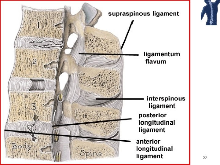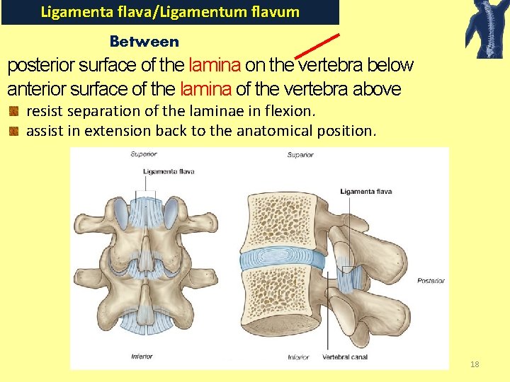 Ligamenta flava/Ligamentum flavum Between posterior surface of the lamina on the vertebra below anterior surface of the lamina of the vertebra above resist separation of the laminae in flexion. assist in extension back to the anatomical position. 18