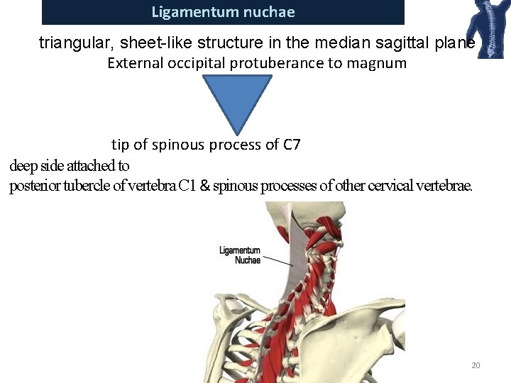 Ligamentum nuchae triangular, sheet-like structure in the median sagittal plane External occipital protuberance to magnum tip of spinous process of C 7 deep side attached to posterior tubercle of vertebra C 1 & spinous processes of other cervical vertebrae. 20