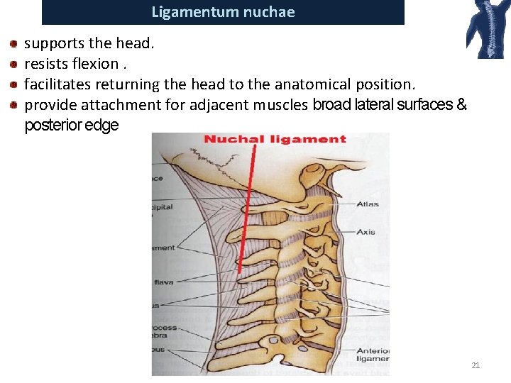 Ligamentum nuchae supports the head. resists flexion. facilitates returning the head to the anatomical position. provide attachment for adjacent muscles broad lateral surfaces & posterior edge 21