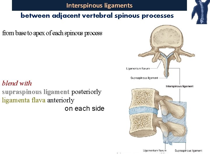 Interspinous ligaments between adjacent vertebral spinous processes from base to apex of each spinous process blend with supraspinous ligament posteriorly ligamenta flava anteriorly on each side 22