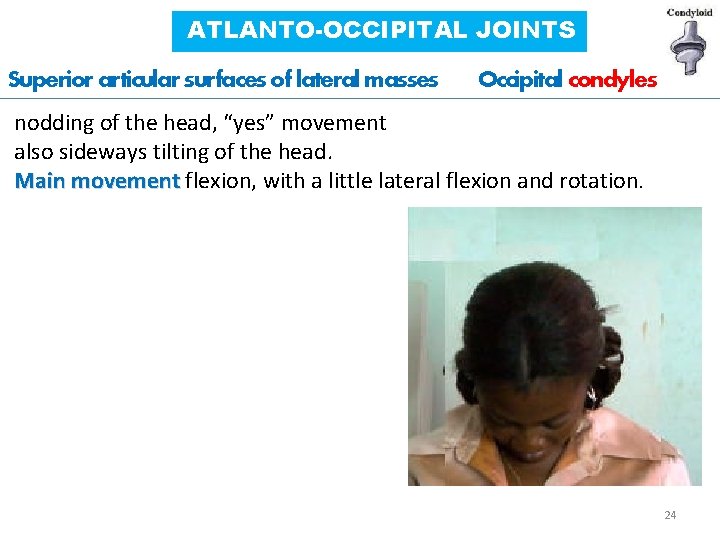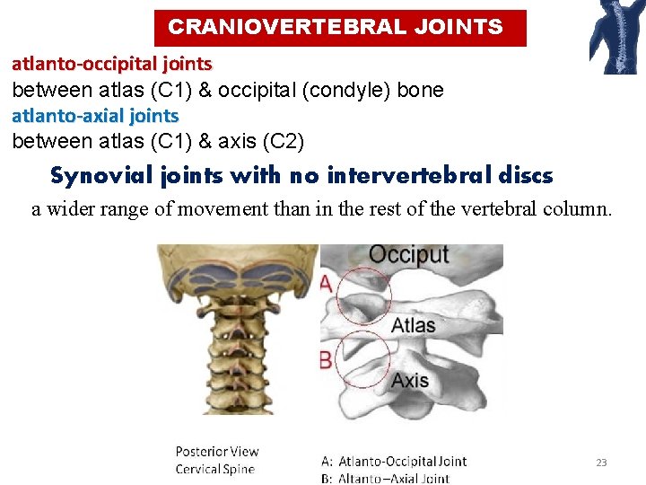CRANIOVERTEBRAL JOINTS atlanto-occipital joints between atlas (C 1) & occipital (condyle) bone atlanto-axial joints between atlas (C 1) & axis (C 2) Synovial joints with no intervertebral discs a wider range of movement than in the rest of the vertebral column. 23
