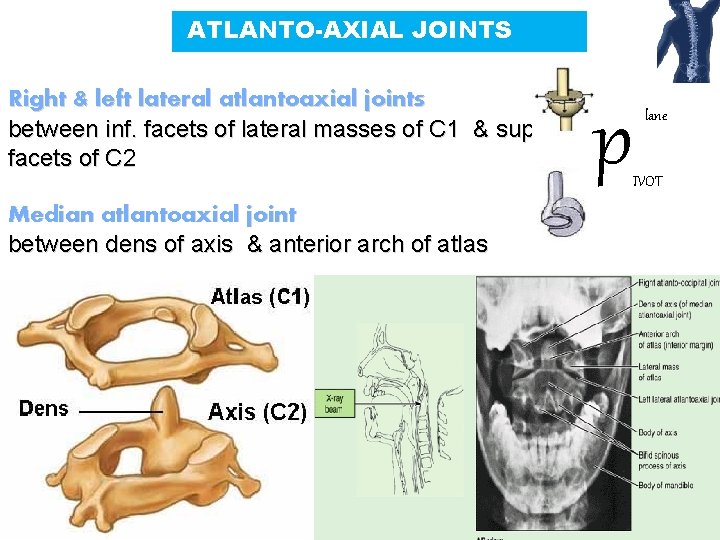 ATLANTO-AXIAL JOINTS Right & left lateral atlantoaxial joints between inf. facets of lateral masses of C 1 & superior facets of C 2 p lane IVOT Median atlantoaxial joint between dens of axis & anterior arch of atlas 26