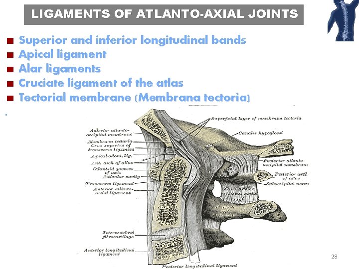 LIGAMENTS OF ATLANTO-AXIAL JOINTS Superior and inferior longitudinal bands Apical ligament Alar ligaments Cruciate ligament of the atlas Tectorial membrane (Membrana tectoria). 28