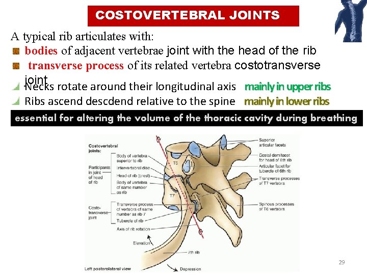 COSTOVERTEBRAL JOINTS A typical rib articulates with: bodies of adjacent vertebrae joint with the head of the rib transverse process of its related vertebra costotransverse joint Necks rotate around their longitudinal axis mainly in upper ribs Ribs ascend descdend relative to the spine mainly in lower ribs essential for altering the volume of the thoracic cavity during breathing 29