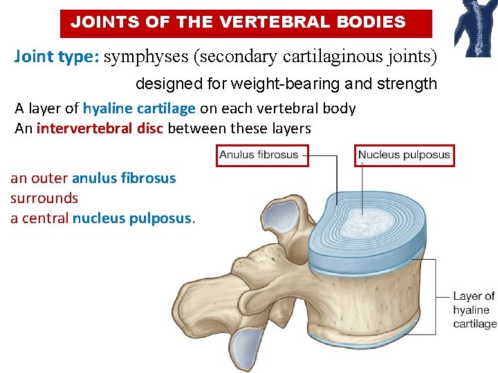 JOINTS OF THE VERTEBRAL BODIES Joint type: symphyses (secondary cartilaginous joints) designed for weight-bearing and strength A layer of hyaline cartilage on each vertebral body An intervertebral disc between these layers an outer anulus fibrosus surrounds a central nucleus pulposus. 3
