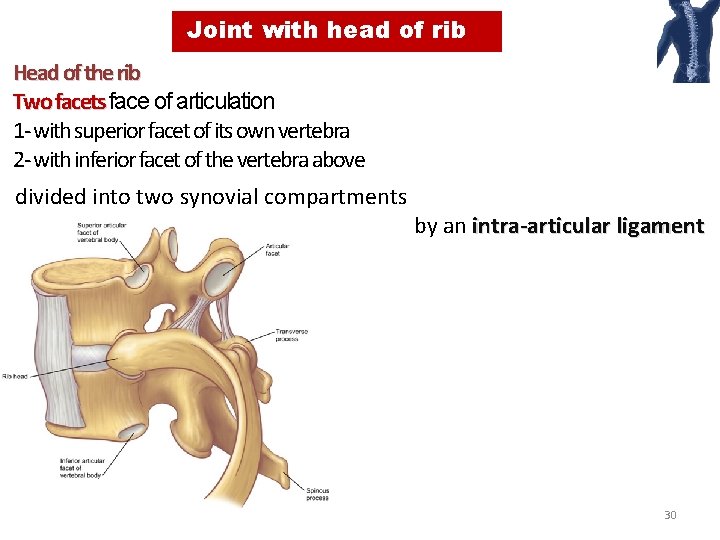 Joint with head of rib Head of the rib Two facets face of articulation 1 - with superior facet of its own vertebra 2 - with inferior facet of the vertebra above divided into two synovial compartments by an intra-articular ligament 30