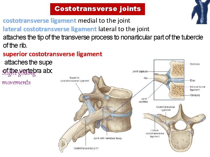 Costotransverse joints costotransverse ligament medial to the joint lateral costotransverse ligament lateral to the joint attaches the tip of the transverse process to nonarticular part of the tubercle of the rib. superior costotransverse ligament attaches the superior surface of the neck of the rib to the transverse process of thegliding vertebra above. Slight movements 31