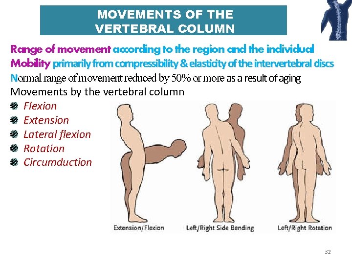 MOVEMENTS OF THE VERTEBRAL COLUMN Range of movement according to the region and the individual Mobility primarily from compressibility & elasticity of the intervertebral discs Normal range of movement reduced by 50% or more as a result of aging Movements by the vertebral column Flexion Extension Lateral flexion Rotation Circumduction 32