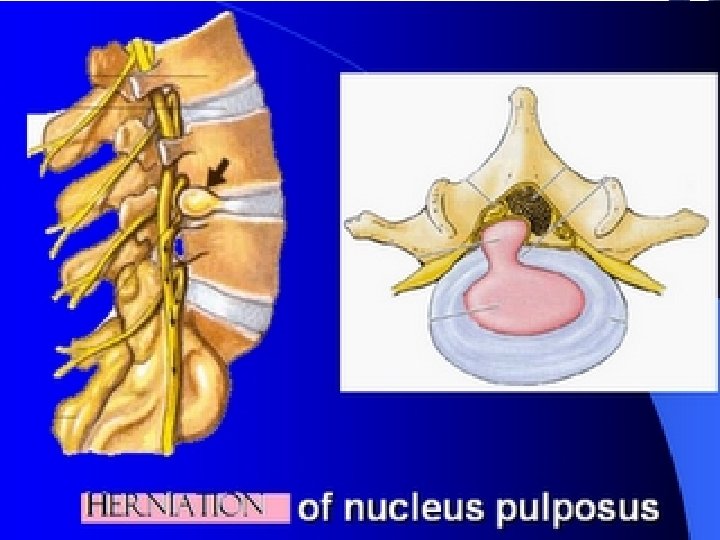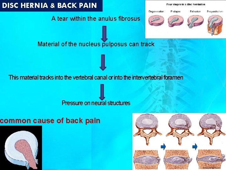 DISC HERNIA & BACK PAIN A tear within the anulus fibrosus Material of the nucleus pulposus can track This material tracks into the vertebral canal or into the intervertebral foramen Pressure on neural structures common cause of back pain