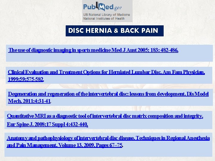 DISC HERNIA & BACK PAIN The use of diagnostic imaging in sports medicine Med J Aust 2005; 183: 482 -486. Clinical Evaluation and Treatment Options for Herniated Lumbar Disc. Am Fam Physician. 1999; 59: 575 -582. Degeneration and regeneration of the intervertebral disc: lessons from development. Dis Model Mech. 2011; 4: 31 -41. Quantitative MRI as a diagnostic tool of intervertebral disc matrix composition and integrity. Eur Spine J. 2008; 17 Suppl 4: 432 -440. Anatomy and pathophysiology of intervertebral disc disease. Techniques in Regional Anesthesia and Pain Management. Volume 13, 2009, Pages 67– 75. 37