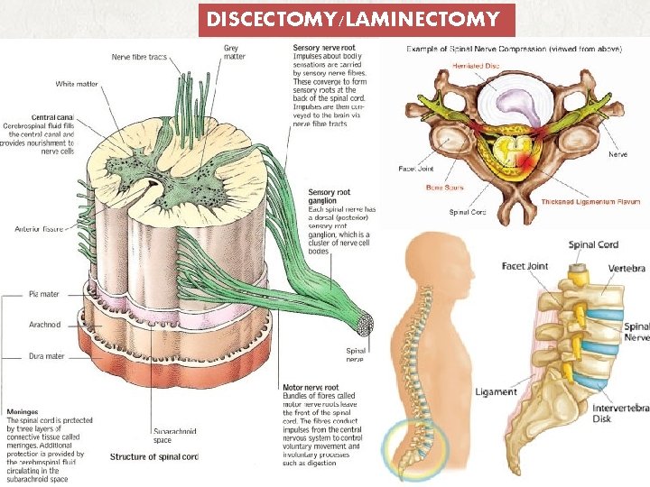 DISCECTOMY/LAMINECTOMY. A prolapsed intervertebral disc may impinge upon meningeal sac spinal cord most commonly the nerve root producing symptoms attributable to that level. PHYSIOTHERAPY OR INTERVENTION BY A NERUOSURGEON 38