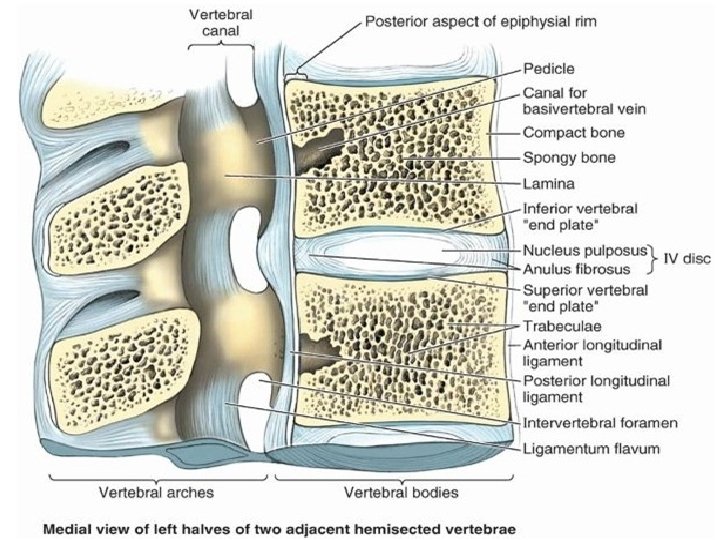 INTERVERTEBRAL DISCS Diagram of sagittal section of vertebral body and disc showing relationship of endplate and longitudinal ligament to the disc and the vertebrae. 1, vertebral body; 2, annulus fibrosus; 3, nucleus pulposus; 4, endplate; 5, spinal nerve root 7