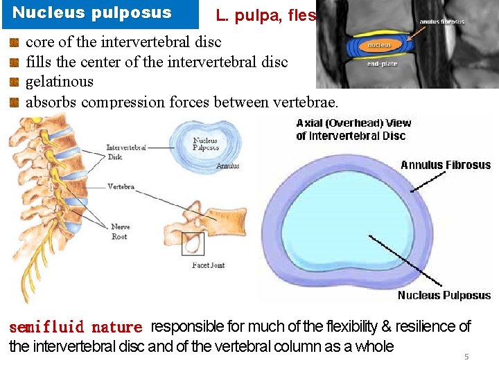Nucleus pulposus L. pulpa, fleshy core of the intervertebral disc fills the center of the intervertebral disc gelatinous absorbs compression forces between vertebrae. semifluid nature natur responsible for much of the flexibility & resilience of the intervertebral disc and of the vertebral column as a whole 5