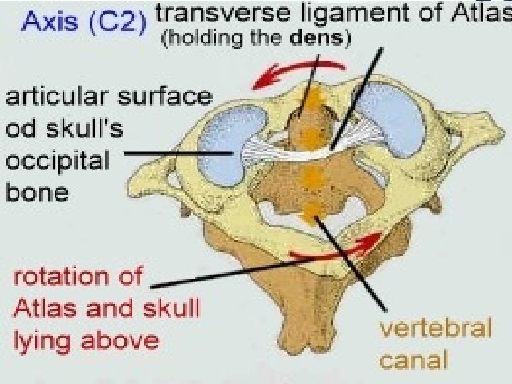 MOVEMENTS OF ATLANTO-AXIAL JOINTS Cranium & atlas rotate on axis as a unit. During rotation of the head Dens/pivot held in a collar anteriorly anterior arch of atlas posteriorly transverse ligament of atlas between tubercles on medial sides of lateral masses of atlas Headturns from sidetoside, disapproval (“no”movement). 27