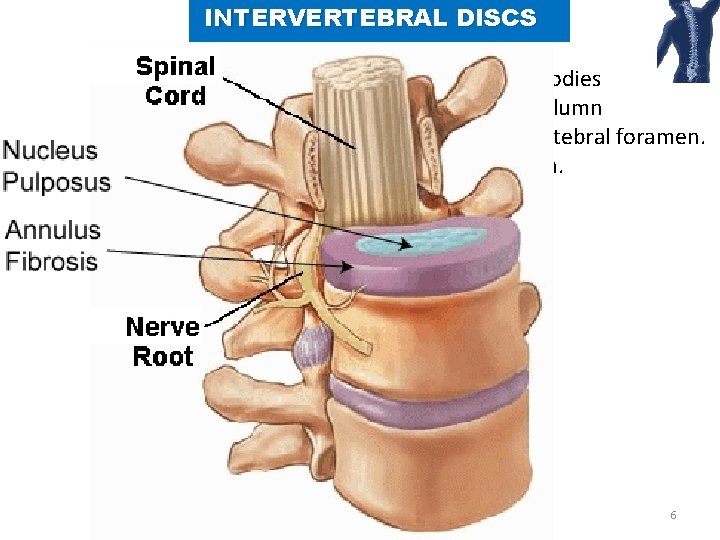 INTERVERTEBRAL DISCS Provide strong attachments between the vertebral bodies Unite vertebral bodies into a continuous semirigid column Form the inferior ½ of anterior border of the intervertebral foramen. 20 -25% of the length (height) of the vertebral column. 6
