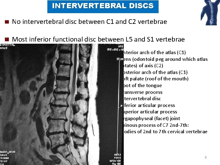 INTERVERTEBRAL DISCS No intervertebral disc between C 1 and C 2 vertebrae Most inferior functional disc between L 5 and S 1 vertebrae 1. Anterior arch of the atlas (C 1) 2. Dens (odontoid peg around which atlas rotates) of axis (C 2) 3. Posterior arch of the atlas (C 1) 4. Soft palate (roof of the mouth) 5. Root of the tongue 6. Transverse process 7. Intervertebral disc 8. Inferior articular process 9. Superior articular process 10. Zygapophyseal (facet) joint 11. Spinous process of C 7 2 nd-7 th: The bodies of 2 nd to 7 th cervical vertebrae 8