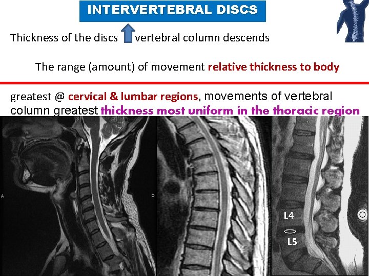 INTERVERTEBRAL DISCS Thickness of the discs vertebral column descends The range (amount) of movement relative thickness to body greatest @ cervical & lumbar regions, movements of vertebral column greatest thickness most uniform in the thoracic region L 4 L 5 9