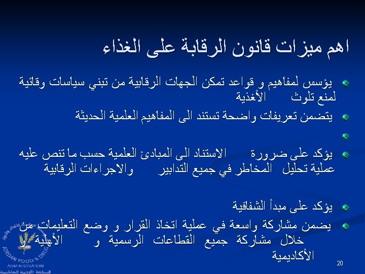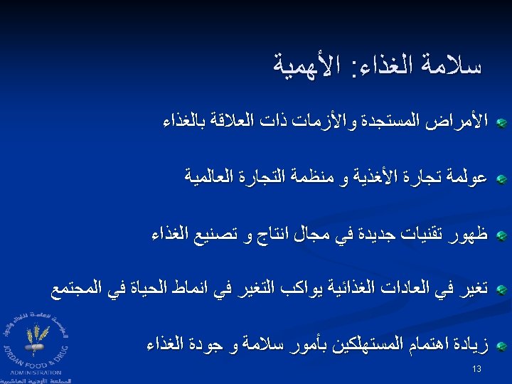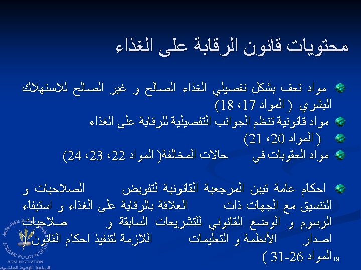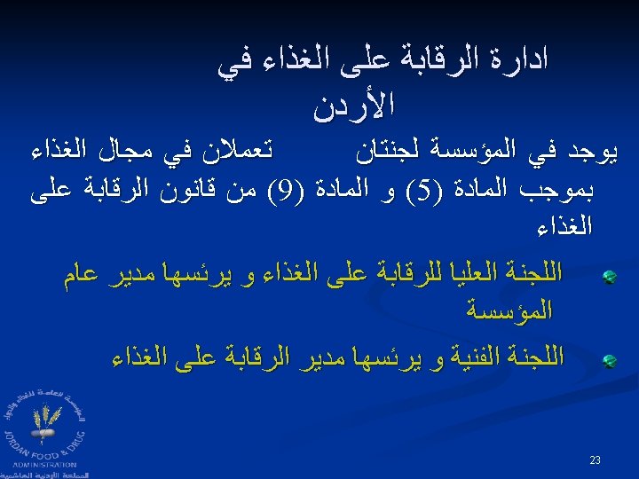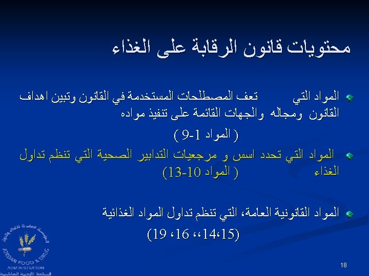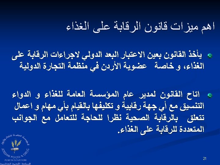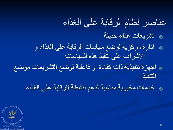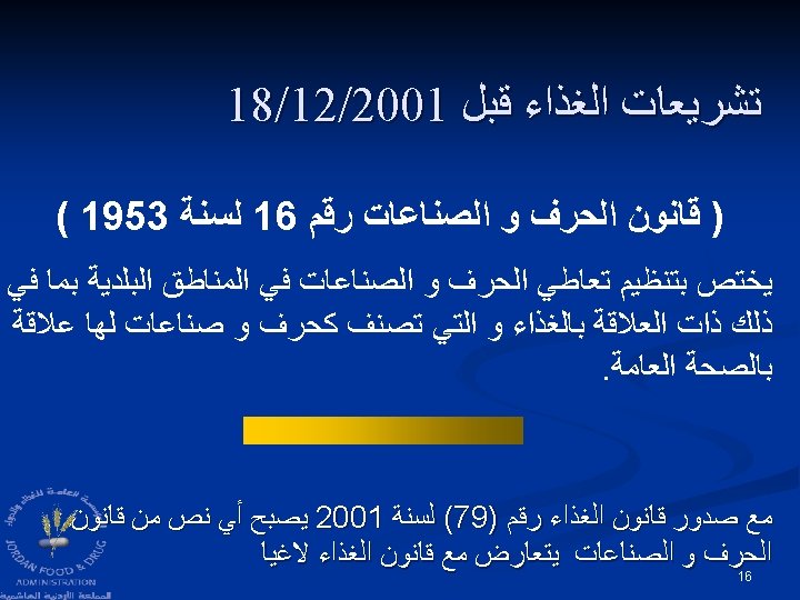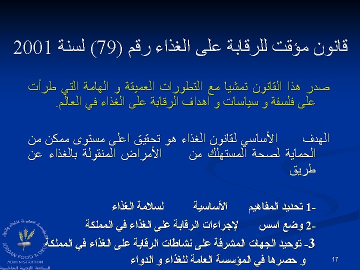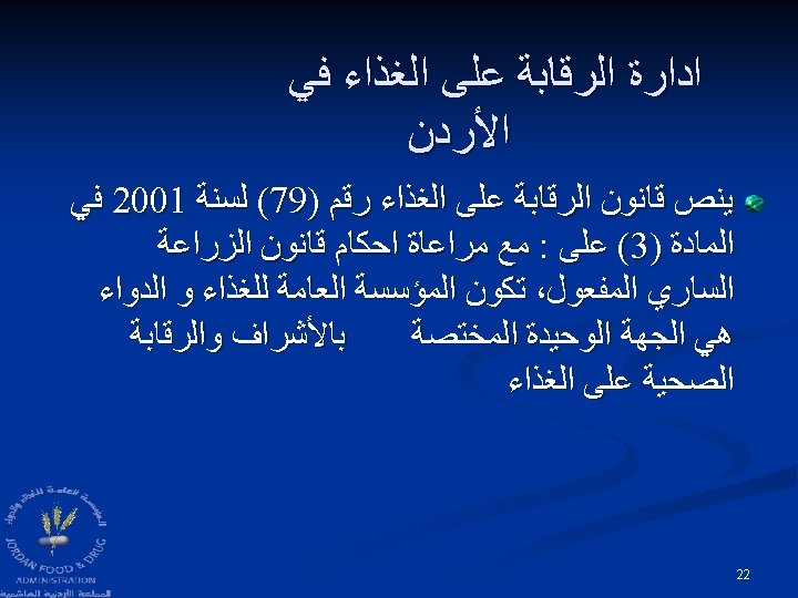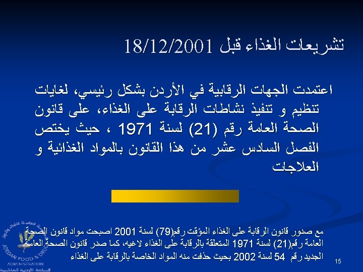 Background As of April, 2003, the Jordan Food and Drug Administration (JFDA) was created by law n The new independent institution (JFDA) took over the following functions n Drug regulatory and quality control functions n Food safety and hygiene n 2