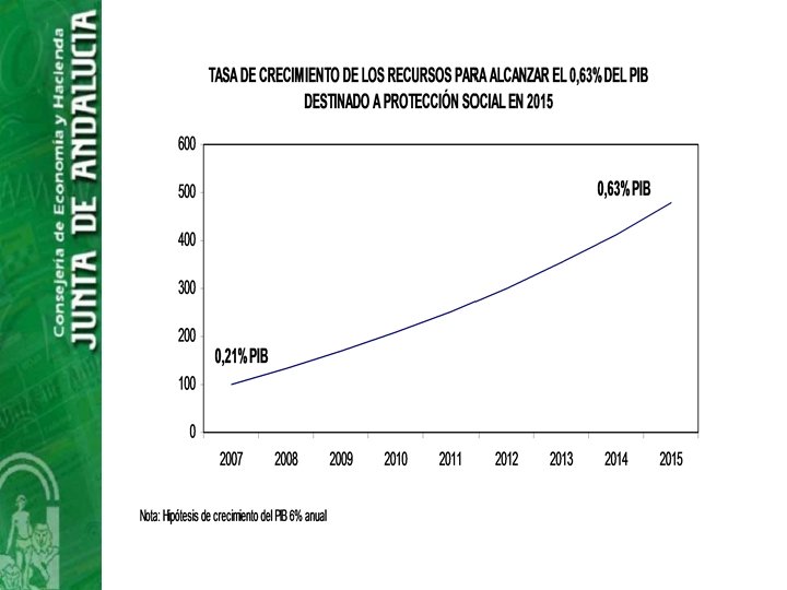 El coste en Andalucía • El esfuerzo financiero esta por determinar: perfilar definitivamente los servicios y prestaciones así como las condiciones de participación de los beneficios. • Si en Andalucía se dedicase un 0, 63 % PIB actual a gasto público en dependencia el importe sería de 741, 0 Millones de € financiados al 50 % AGE -JA • Existe una gran variabilidad a la hora de las estimaciones en financiación de los supuestos sobre tipo de prestación y coste. • En cualquier caso es un esfuerzo muy importante pasar del 0, 2 % del PIB al 0, 6% del PIB, que requerirá un importante crecimiento de los recursos anualmente