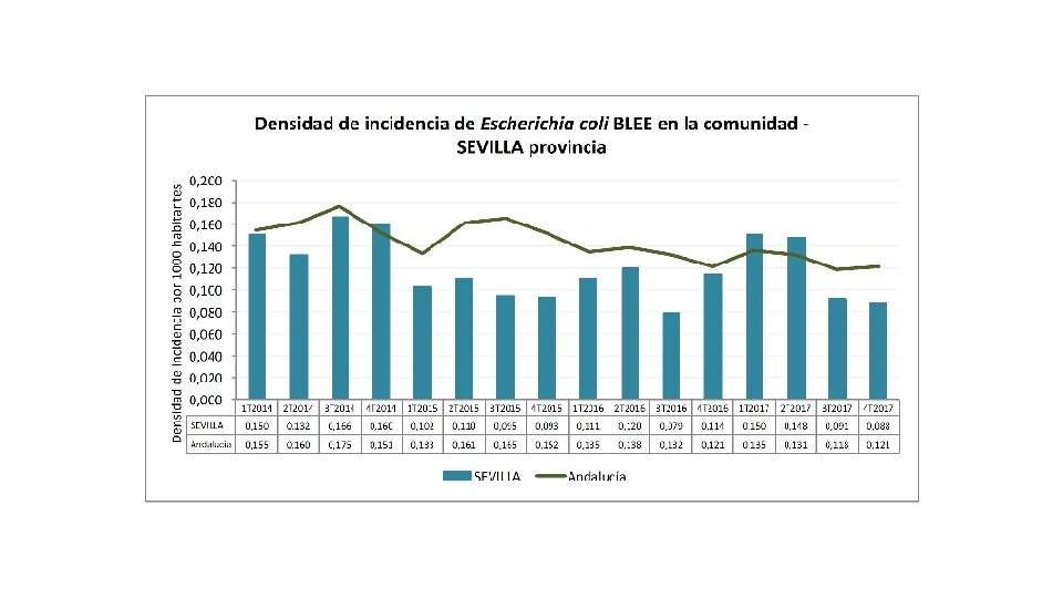 INDICADOR DE RESISTENCIA • PROAD 006. Incidencia acumulada de pacientes con infección/colonización por E coli productor de BLEE. • Definición: Nº de pacientes ambulatorios con infección/colonización por E coli productor de BLEE*1000/población del área