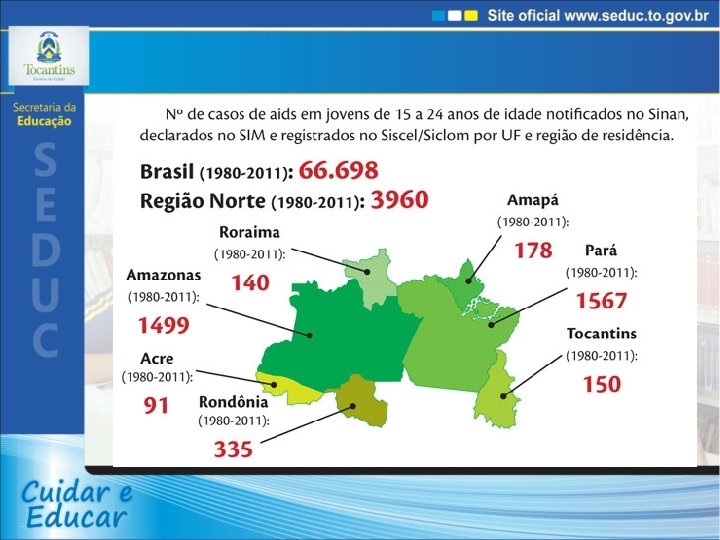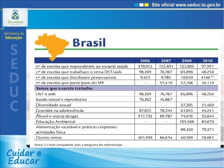 Desafios • Ampliar o número de municípios com grupos gestores constituídos. • Ampliar a oferta de preservativos nas escolas. • Fortalecer a capacidade de monitoramento das equipes gestoras e ampliar o conjunto de informações sobre as ações em todo o estado. • Ampliar o número de escolas que respondem ao encarte saúde – censo escolar. • Fortalecer o envolvimento dos jovens. • Desenvolver ações de educação sexual para crianças e préadolescentes. • Qualificar o acolhimento de adolescentes e jovens nos serviços de saúde.