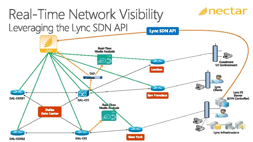 Events: • Start Dialog Attributes: • SIP URIs • • Call ID • • • IP SA/DA • Protocol Transport S/D Ports Media Type Codec & BW NOC U 1 -U 2 = S 2, CE 2, PE 2, R 3, PE 3, CE 3, S 3, W 2 Start Dia log 5 -Tuple In fo U 1 – U PSTN 2 S 1 SP Data Center Controller CE 1 PE 1 IGP/EGP Peer with Network Topology WAN R 1 PE 2 PE 4 R 2 R 4 R 3 CE 4 Signaling Media CE 2 PE 3 S 4 Diagnostics S 2 W 1 Lync SDN API U 3 CE 3 S 3 Branch 3 W 2 U 2 Branch 2 U 1 Branch 1