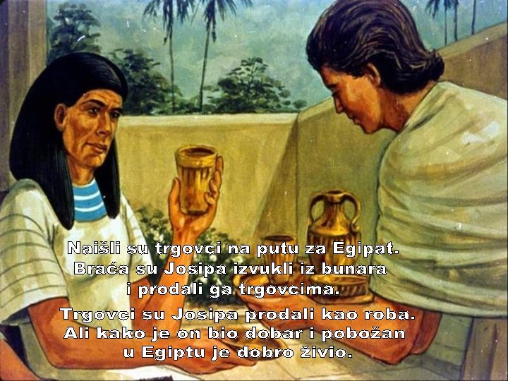 JOSIP EGIPATSKI Otac Jakov imao je dvanaest sinova. Najviše je volio Josipa. Dao je za njega sašiti novu odjeću. Josipova braća bila su zbog toga jako ljubomorna.