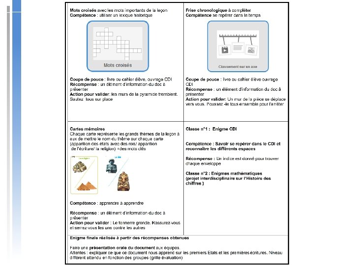 Un retour nécessaire sur le jeu L’après jeu : • Le recueil des ressentis des élèves • La phase des enseignements: Retour sur les énigmes: les notions et savoirs. Présentation au reste de la classe: comment avons-nous réussi? Retour sur le travail de coopération • Améliorations possibles source: scape. enepe. fr
